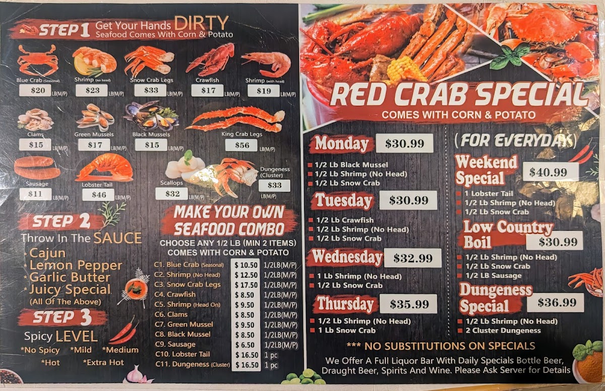 Introducing the menu at Red Crab - Juicy Seafood - Fredericksburg is a delightful voyage into the world of seafood. Located conveniently at 1801 Carl D Silver Pkwy, this eatery boasts a vibrant selection that caters to all palates. Indulge in their All Day Menu, featuring crispy Fried Catfish and succulent Oysters, perfect for those who love fried delicacies. For sandwich lovers, their Po Boy options—whether shrimp, tilapia, or chicken—deliver a satisfying crunch and rich flavors.